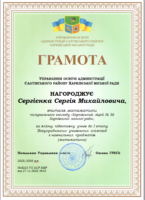 Грамота от Управління освіти адміністрації Салтівського району Харківської міської ради за якісну підготовку учнів до І етапу Всеукраїнських учнівських олімпіад з навчальних предметів (математика) у 2025-2026 навчальному році