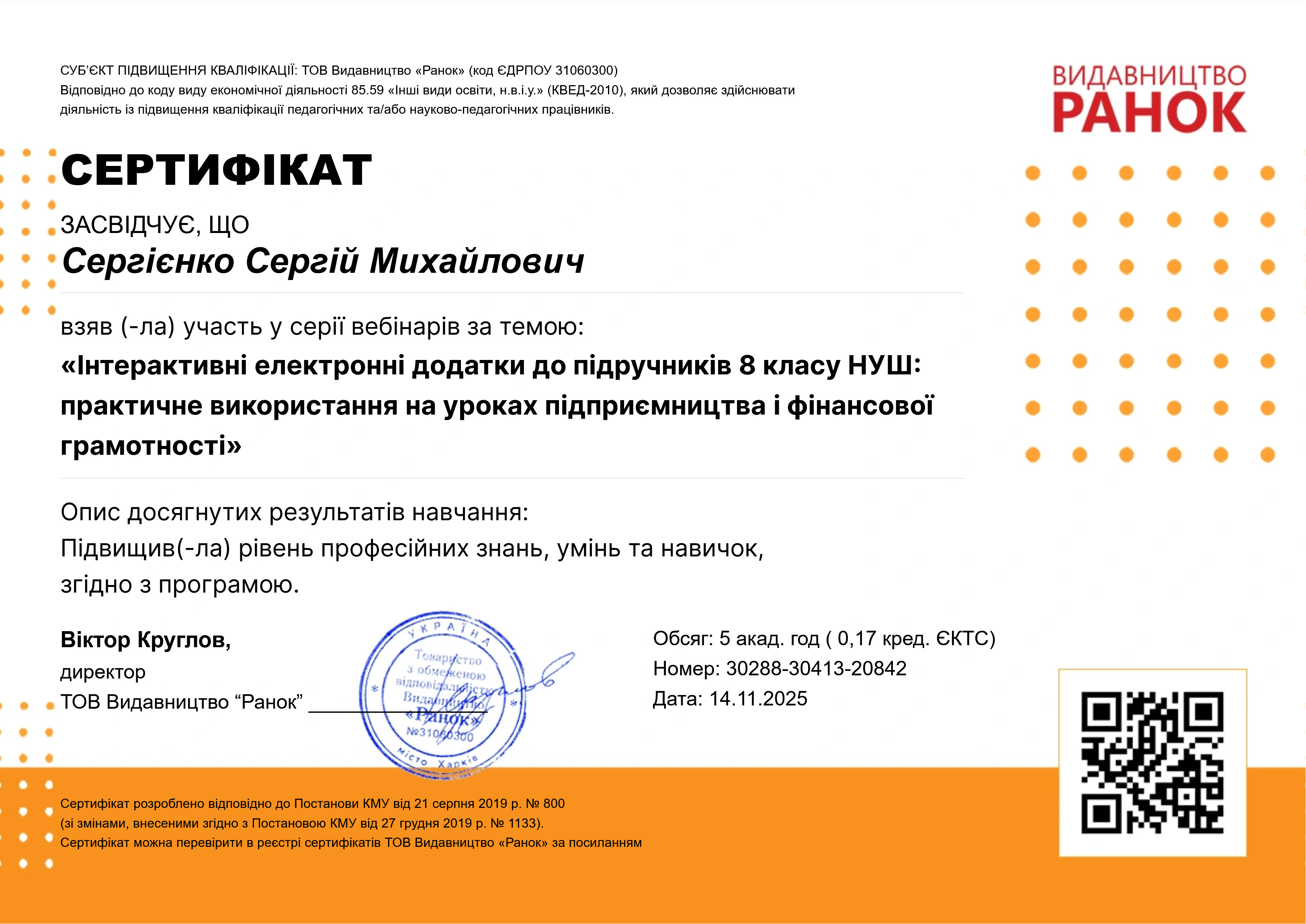 14.11.2025 Вебінар "Інтерактивні електронні додатки до підручників 8 класу НУШ: практичне використання на уроках підприємництва та фінансової грамотності", 5 годин. diploma