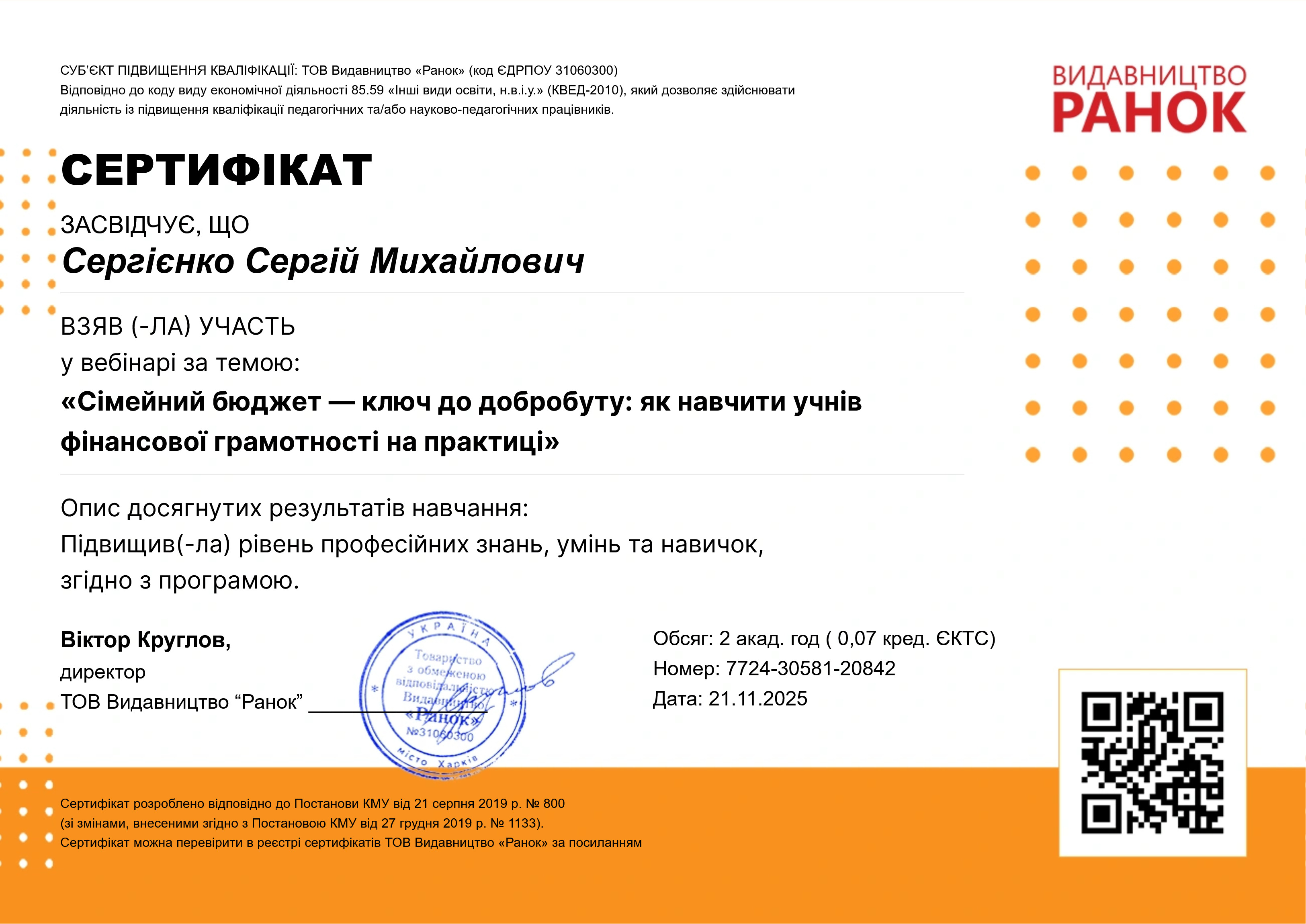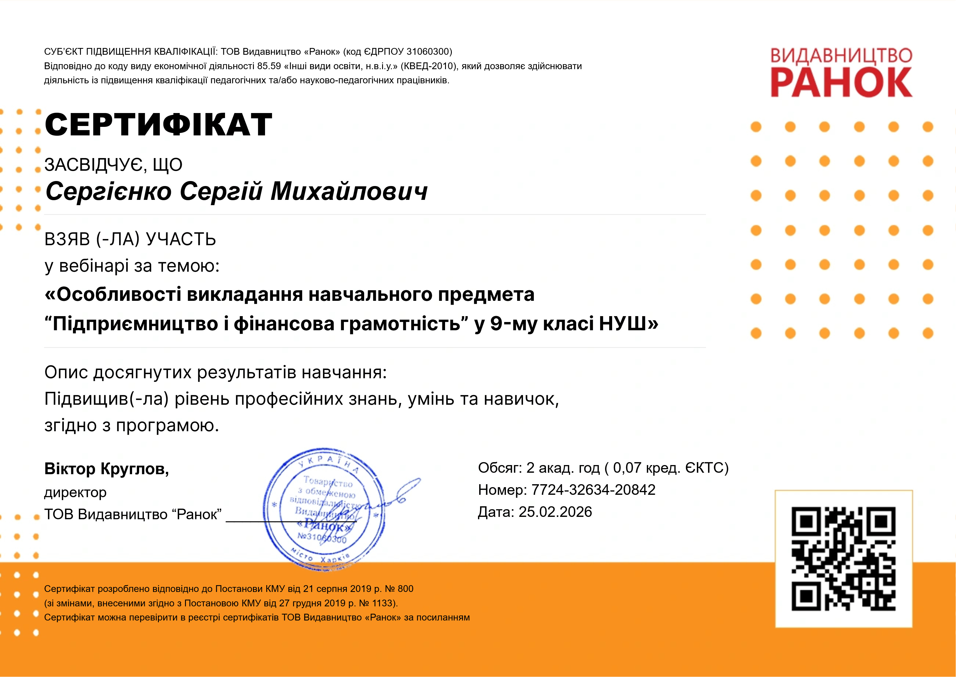 30.05.2025 ДНУ "Інститут модернізації змісту освіти", ТОВ Видавництво "Ранок" пройшов підви щення кваліфікації за програмою " Сучасні підходи до викладання предмета " Підприємництво і фінансова грамотність" у 8-9 класах НУШ. Методика формування фінансової грамотності у школярів", 30 годин. Сертифікат
