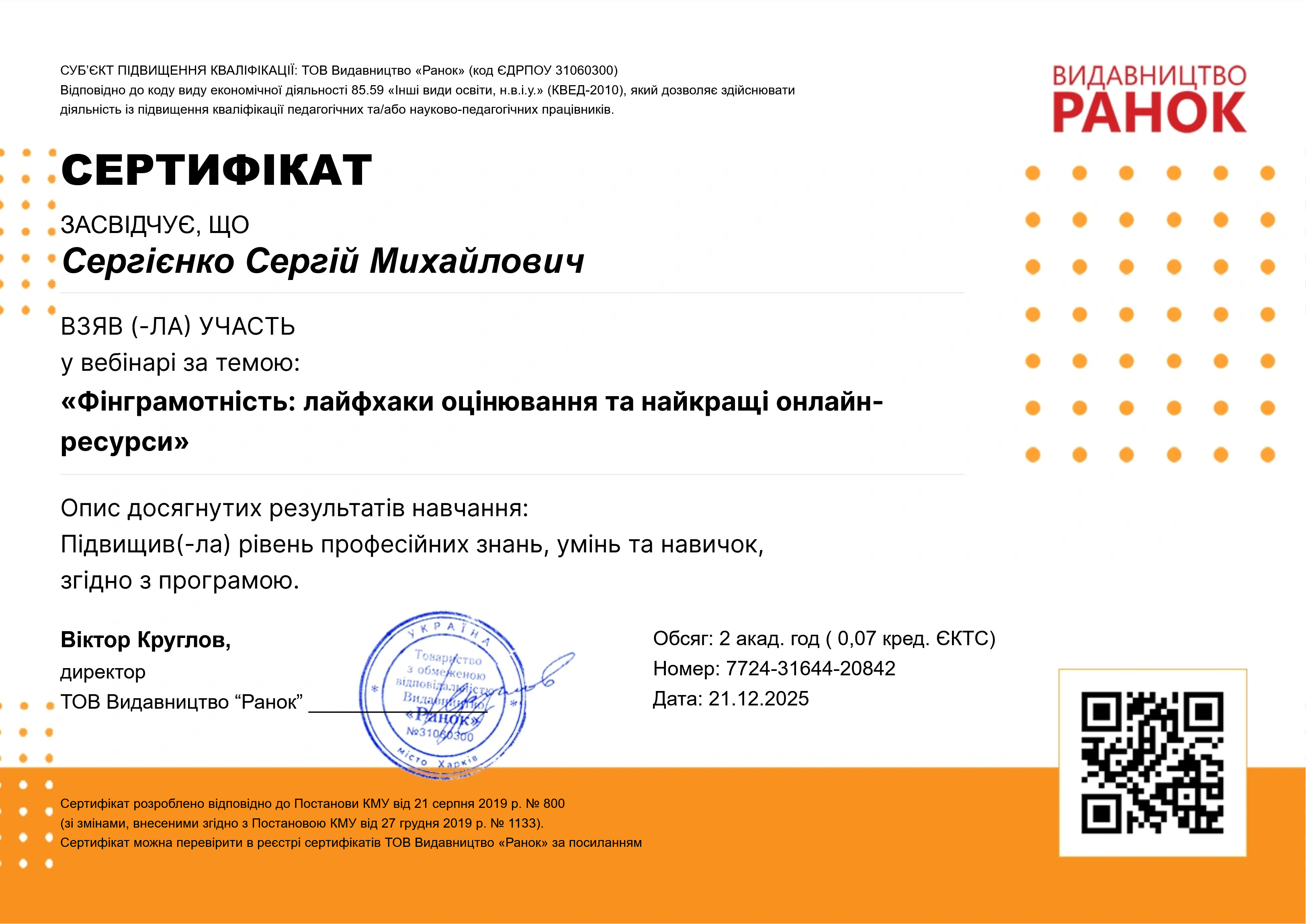 21.12.2025 Вебінар «Фінграмотність: лайфхаки оцінювання та найкращі онлайн-ресурси», 2 години. diploma