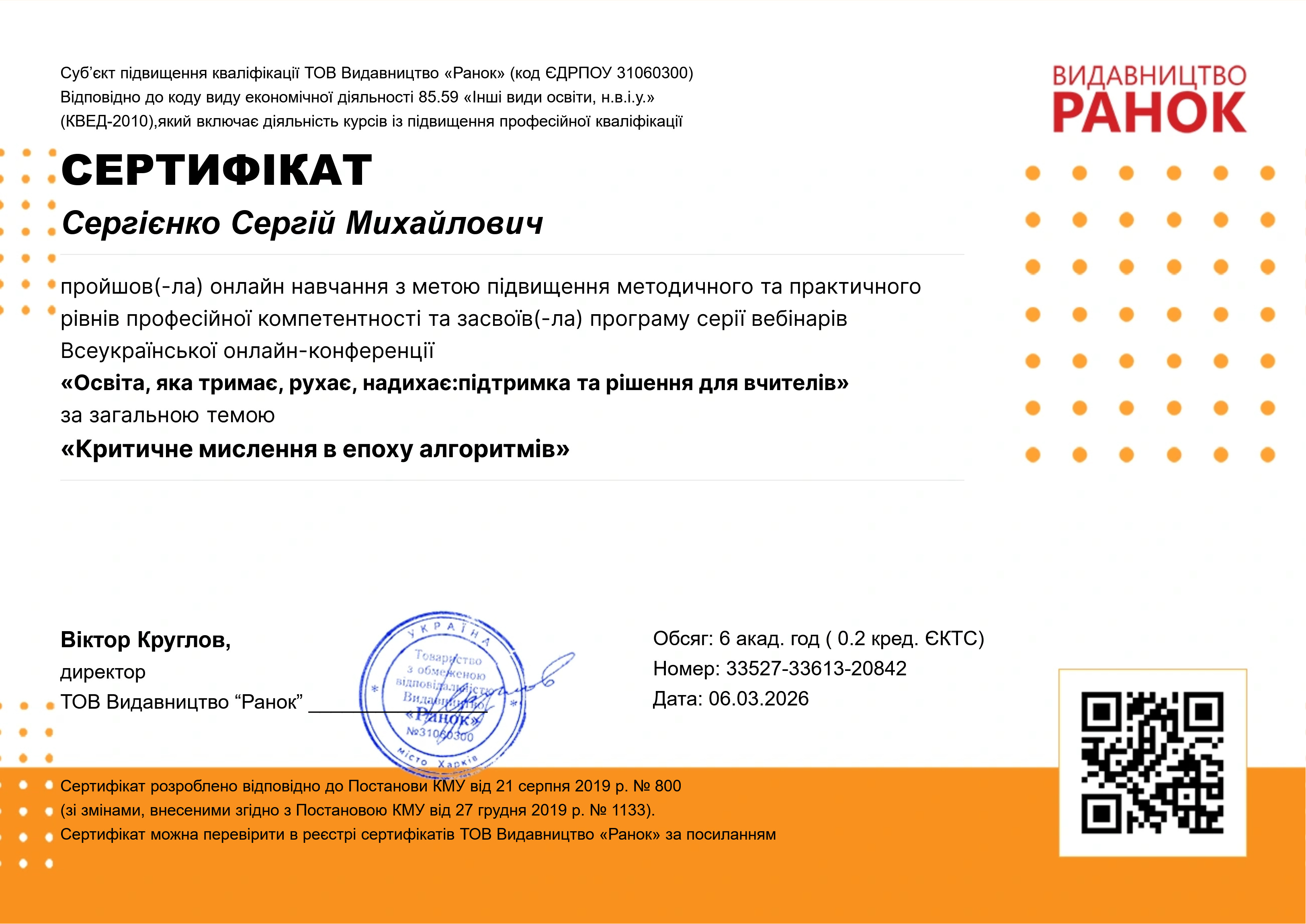 06.03.2026 Серія вебінарів Всеукраїнської онлайн-конференції "Освіта, яка тримає, рухає, надихає: підтримка та рішення для вчителів" за загальною темою "Критичне мислення в епоху алгоритмів", 6 годин. diploma